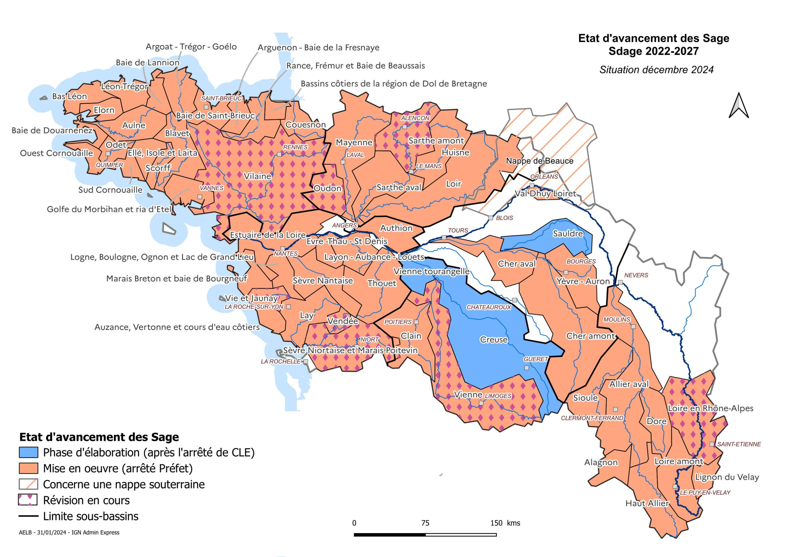 Sur le bassin Loire-Bretagne, 54 SAGE sont mis en œuvre, 7 sont en phase de révision et 3 en élaboration. La Bretagne est entièrement couverte par des SAGE (20).